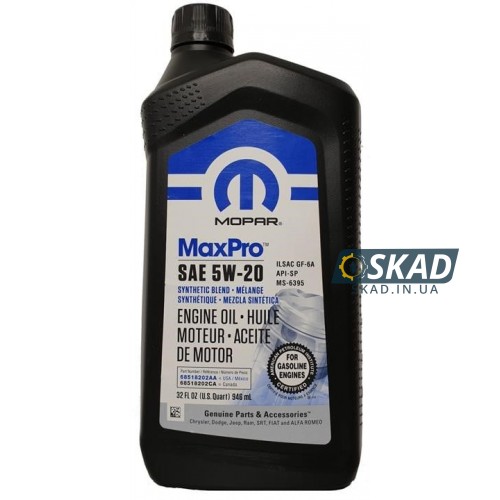 MOPAR MaxPro SAE 5W-20 — синтетична моторна олива для бензинових і дизельних двигунів автомобілів Chrysler, Dodge, Jeep. Забезпечує надійний захист, стабільну роботу та економію пального.